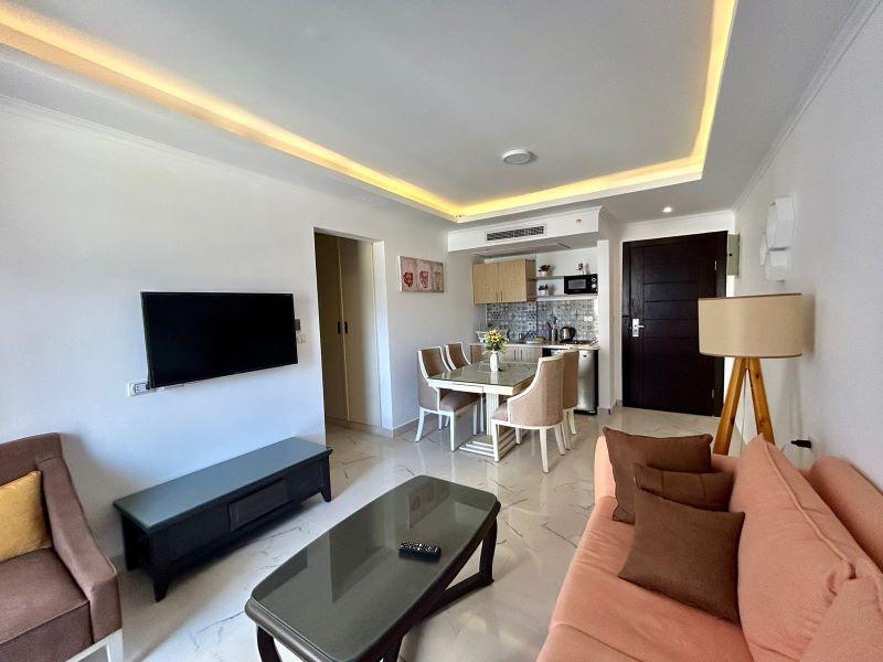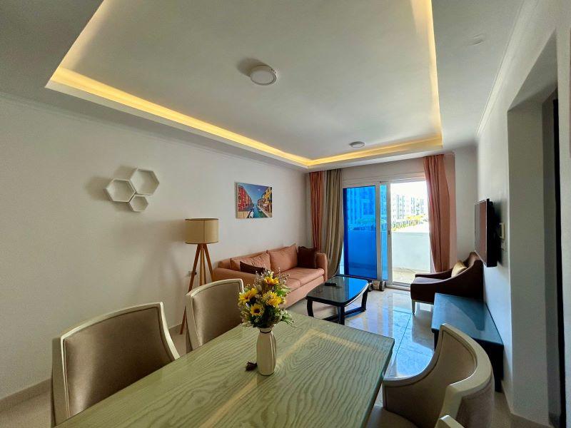 Die Wohnung ist komplett möbliert und mit allen notwendigen Geräten ausgestattet - 2 Einbauschränke, Klimaanlage, TV, Wasserboiler, Minibar, Mikrowelle. Wohnungsaufteilung: Wohnzimmer mit offener Küche, Schlafzimmer, Badezimmer, Balkon.